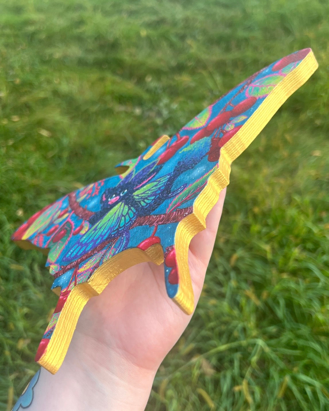 ✶ This is my first painting on a big wooden canvas! I’m honestly in awe! It looks like a snapshot of a sweet fantasy world. This curly little dragon moth is searching for their favorite berries! I hope you brought a bag so they can take some home!